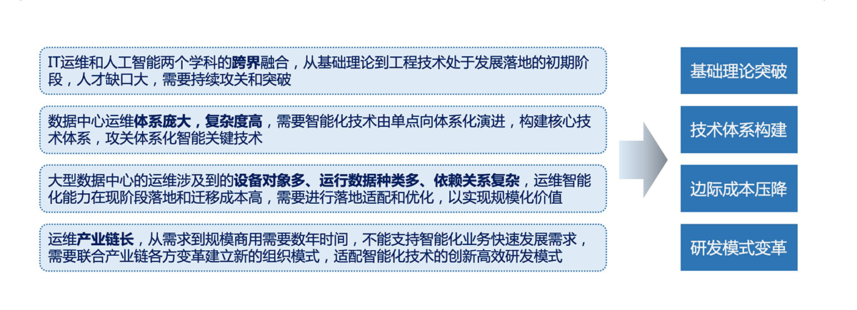 运维智能化作为AI技术与传统运维的前沿交叉领域,处于技术发展落地的初期阶段,行业用户在各类细分场景中创新实践,科研学术成果不断涌现,但是在国内外尚未形成统一的通用标准和技术规范。在基础领域、技术体系、规模成本和研发模式等方面存在诸多挑战,亟需攻关突破。