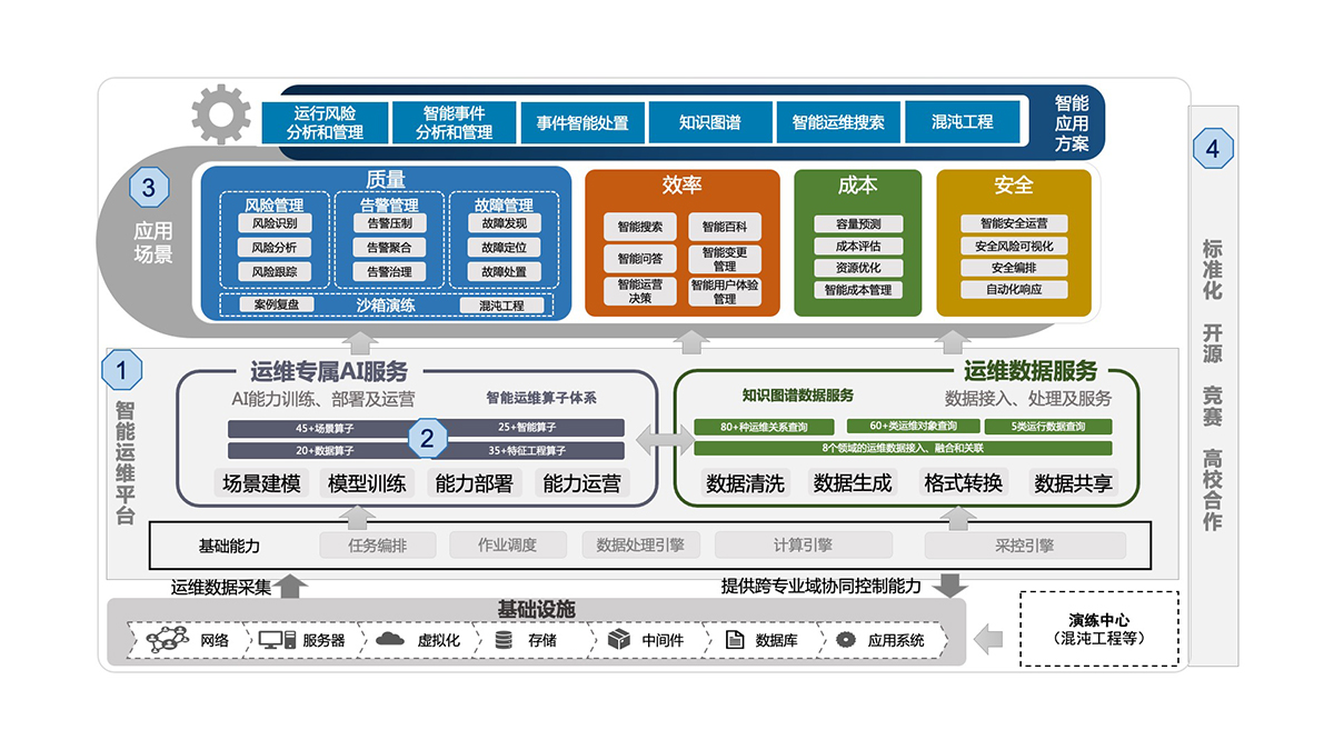 ③ 应用:围绕运维“质量、效率、成本、安全”四个目标打造标杆应用场景,将AI技术融入运维流程,重点实现降本、增效、提质。