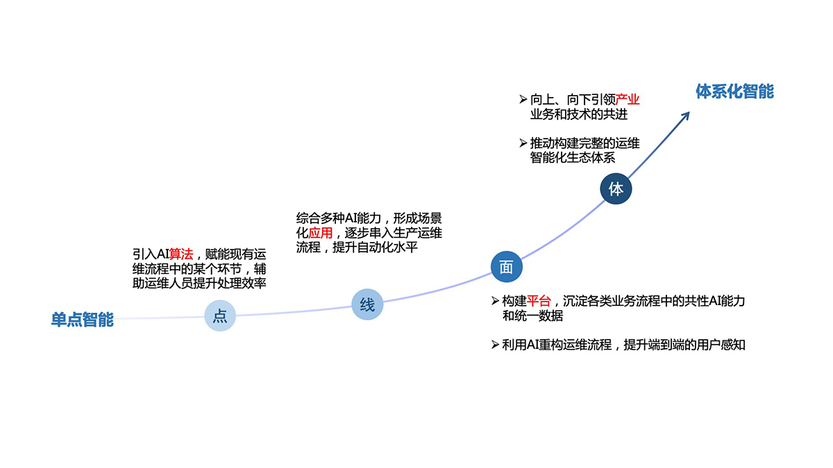 体:通过面的构建和提升,最终形成向上和向下引领产业业务和技术的共进,构建完整的智能运维的生态化体系。