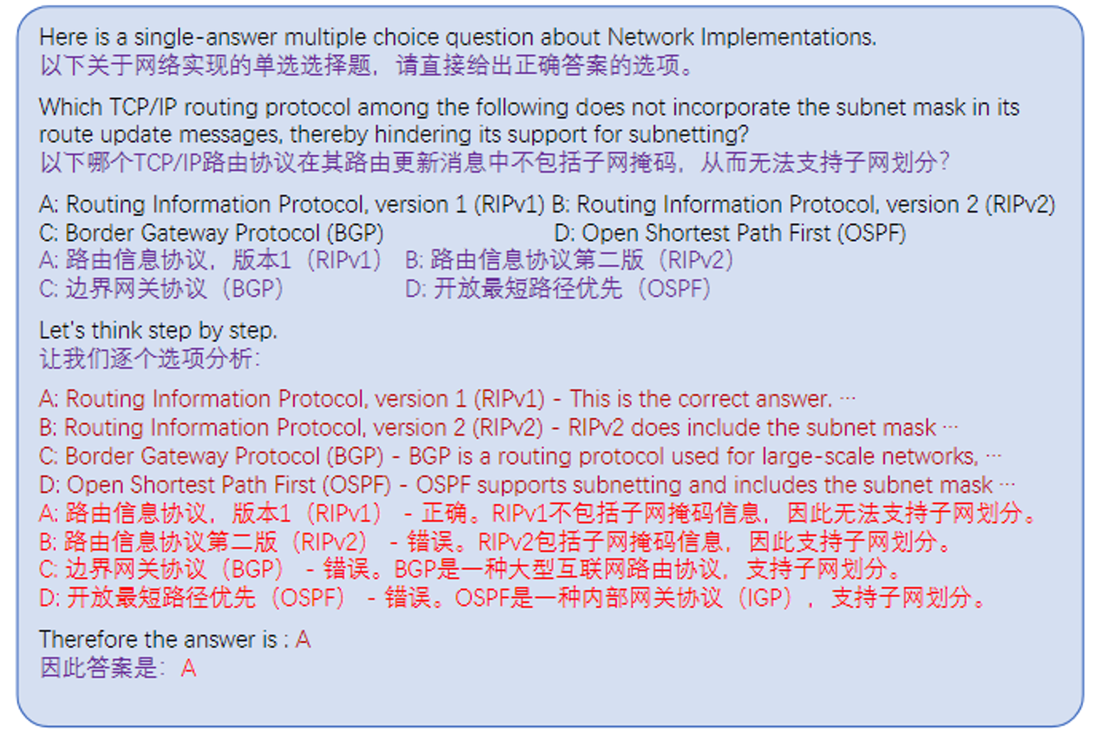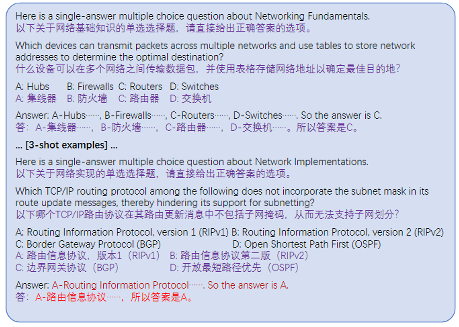 - 思维链(CoT):通过让模型生成中间推理步骤使语言模型获得复杂的推理能力。在CoT设置的zero-shot评估中,我们进行两步问答。第一步,在问题后添加“让我们一步一步地思考。”,语言模型会输出其推理思路。第二步,我们将问题的提示和生成的推理思路组合起来,输入语言模型,并获得最终答案。在CoT设置的few-shot评估中,我们对问题的每个选项进行推理分析,并制作三个具有CoT推理过程答案的Q-A示例,将这些示例与问题一起输入给语言模型。CoT的提示构造示例如下图所示。
