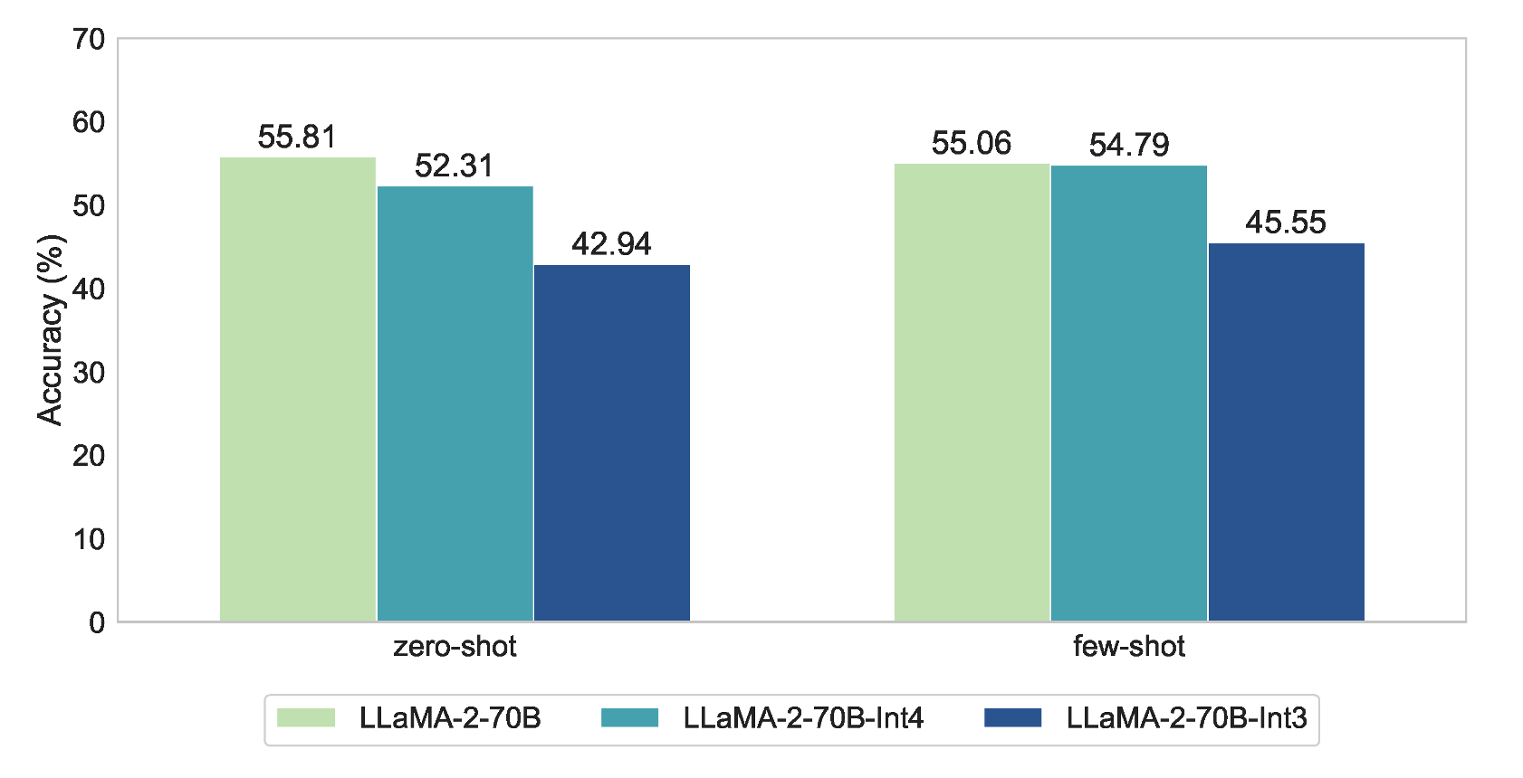 上图展示了LLaMA-2-70B在中英文客观问题上的不同量化参数的准确性。我们使用Naive设置下进行了zero-shot和few-shot评估。显然,在推理过程中使用量化会降低LLM的性能。