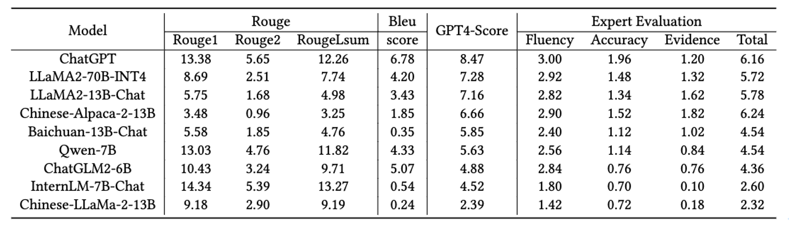 我们观察到,基于Rouge和Bleu得分的排名与GPT4-Score和专家评估的排名并不一致。实际回答性能较差的模型可能会生成关键词,从而得到较高的Rouge和Bleu得分。相反,由于与标准答案的措辞差异,回答性能好的模型可能会得到较低的Rouge/Bleu得分。