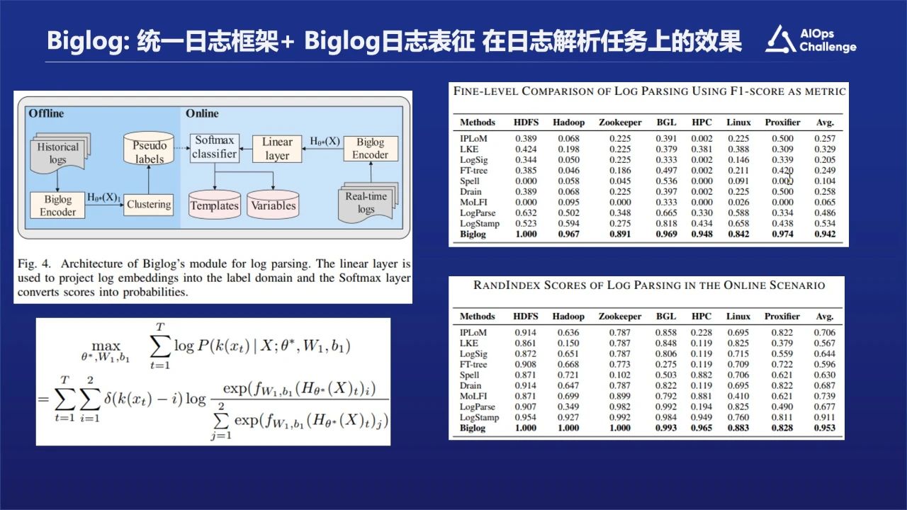 为了解决上述痛点问题,我们团队做了深入的研究工作,有两个解决方案,第一个就是Biglog, 基于大规模日志预训练理解日志机器语言、构建日志多任务统一框架,解决传统运维系统没有统一框架的问题和传统日志分析对于日志语义理解特征的一些痛点问题。我们是基于LogHub开源数据再加上自己的数据做的训练工作。