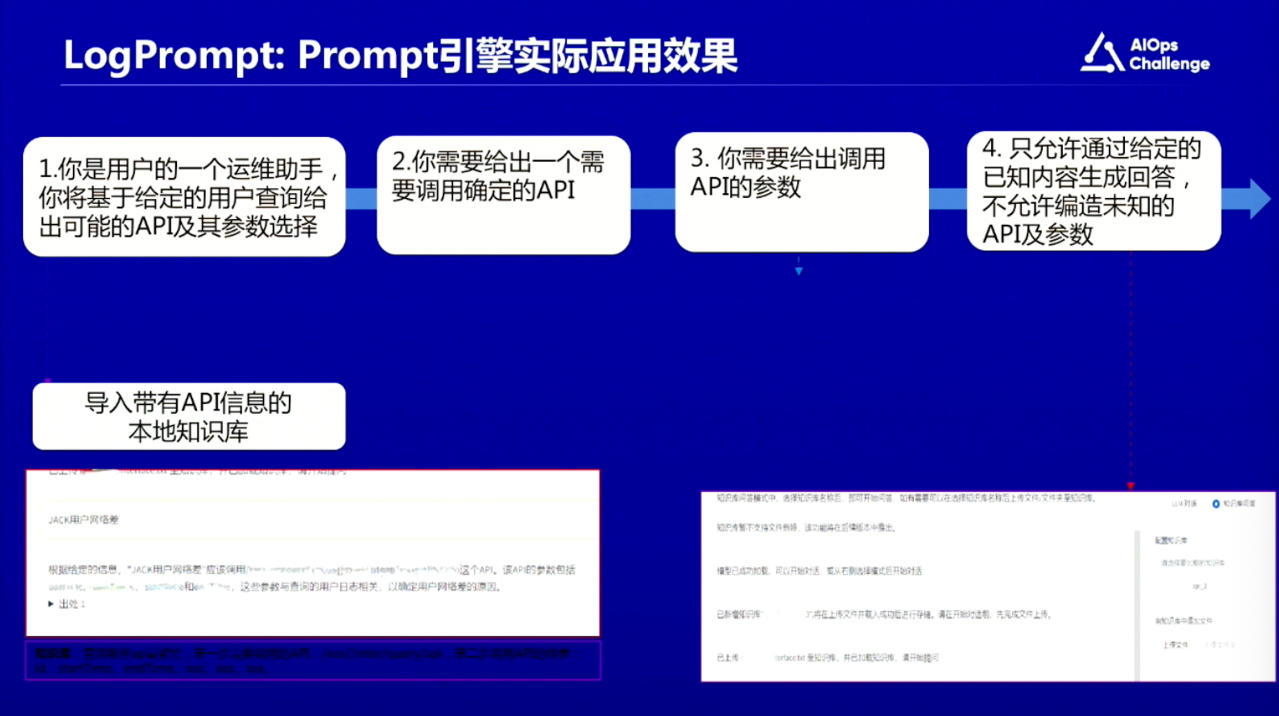 我们把LogPrompt放在华为乾坤云系统上,做一些实际的效果和应用。把我们的Prompt引擎放在乾坤云的 UI助手上面,相当叠加了外挂的知识库,也就是会有一个上下文增强的一个知识,然后基于这样知识,可以做到一些类似于LLM加Agent的效果,把一些API调用,能够做到比较好的精准反馈。
