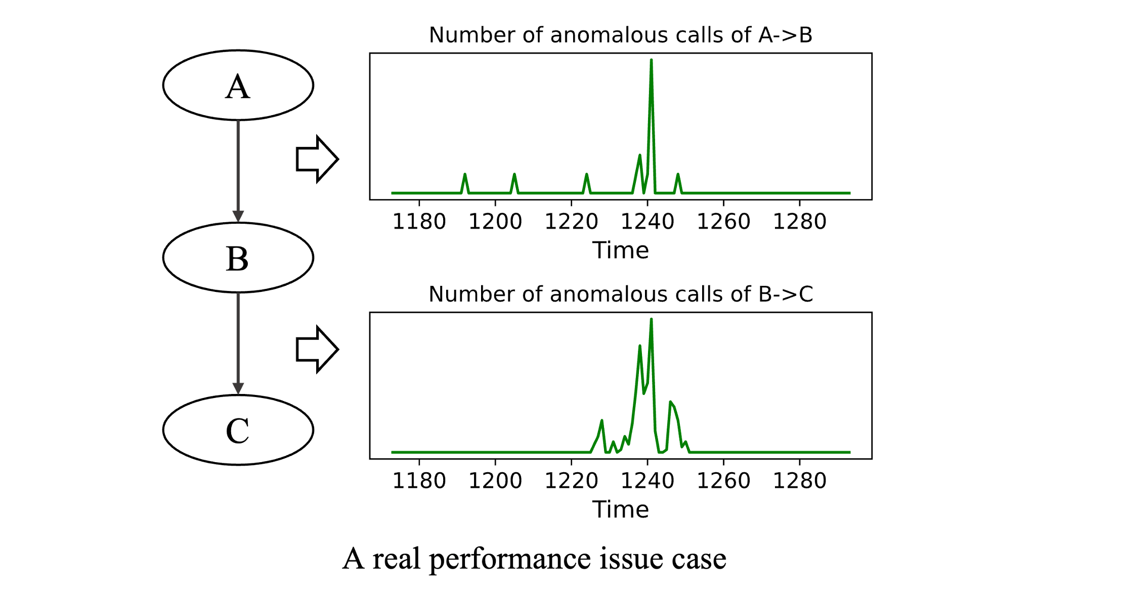 有些工作将调用关系视为异常传播的因果关系,这在文章提到的场景中过于简化。图1展示了一个真实的性能问题,其中A、B和C分别代表三个微服务。A调用B和B调用C的异常调用次数都增加了,然而,当运维人员深入调查细节时,他们发现C没有任何有意义的错误报告。另一方面,来自B的调用(即B调用C)是异常的,这是因为B耗尽了文件描述符,无法与C建立新的连接。总之,A调用B和B调用C的异常率是由B的系统资源所导致的,在这种情况下,B是根本原因服务,这无法通过沿着调用关系进行搜索来定位。在调查了腾讯数百个性能问题后,文章发现超过35%的性能问题受到这类情况的影响。