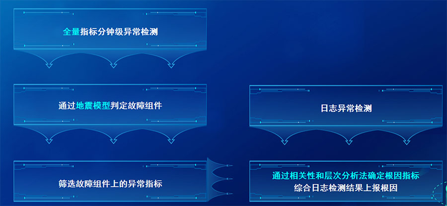 我们的方案分两条线并行开展,一条线是根据全量指标的异常检测结果,通过地震模型(之后的内容会详细介绍地震模型)判定出故障组件,再筛选出故障点上的异常指标,通过相关性和层次分析法的裁剪确定出根因指标,然后和另外一条线日志异常检测的结果合并,作为最终根因一并上报。