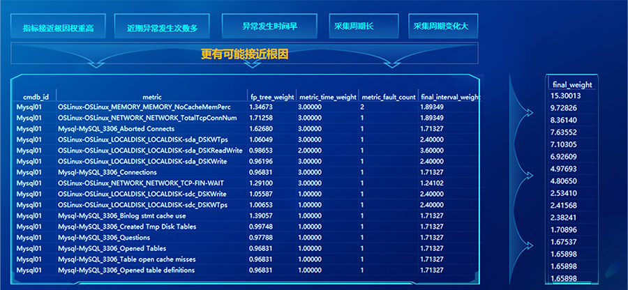 在候选根因中,除了指标接近根因的权重外,我们还额外考虑了指标在其它的几个维度的权重,如近5分钟内异常发生次数多、异常发生时间早,针对不同采集周期的指标,如磁盘指标的采集周期比较长,在之前几个维度的计算中是比较吃亏的,因此把指标的采集周期长度、周期变化程度也考虑的进来。最终这几个维度的值相乘计算出综合权重,按综合权重final_weight列倒序排列,取topN作为最可能是根因的指标。