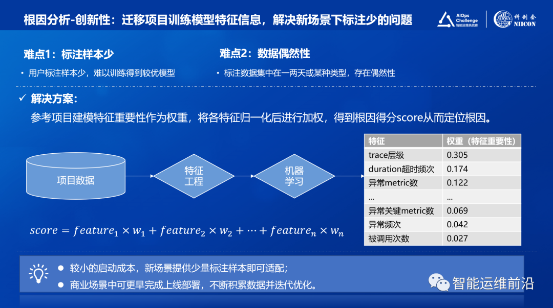- 对归一化后的特征,按特征重要性进行加权求和,所得score即为根因预测分数。
