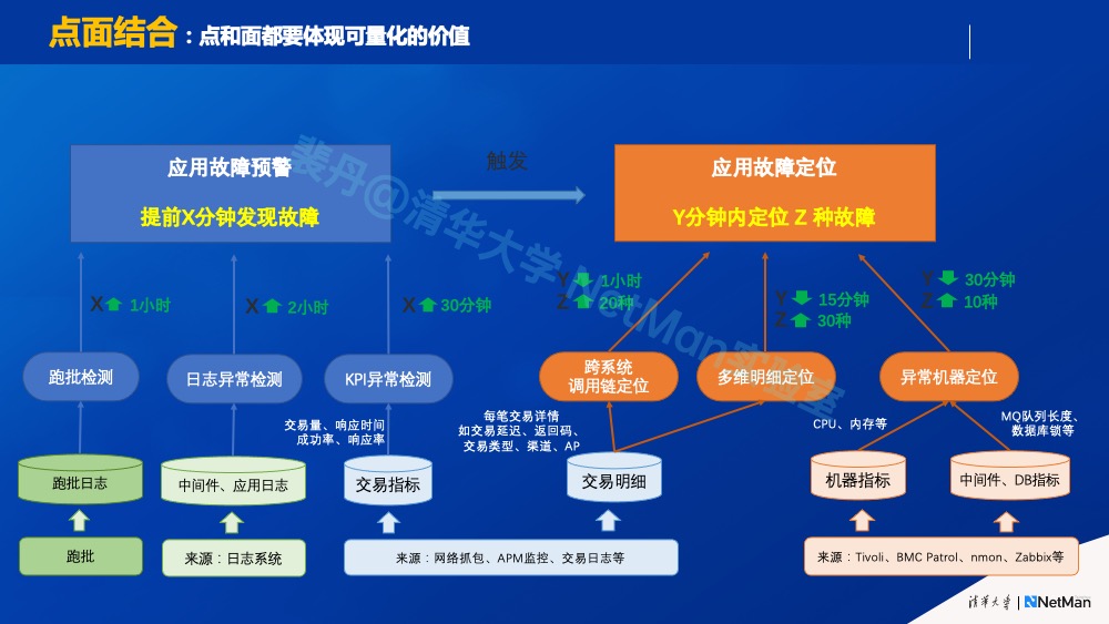 规划落地AIOps时,有两种误区:一是只看有可量化价值的具体的技术“点”(如业务指标异常检测);二是只看有可量化的端对端价值的场景(“面”,如MTTR)。而我们总结的原则是“点面结合”。比如,也许因为依赖其它技术点, 业务指标异常检测还没有产生端对端的效果(降低MTTR),但是其本身有一些评估指标(相比传统方法提前X分钟发现故障),这能给予我们很大的希望。就像医院里一个医疗设备,它比原来的设备检测得准、检测得快,它的价值就应该得到认可,它的价值不能因为需要一些其它技术点才能产生完整的端对端价值而被否认。反之,对于端对端价值的不懈追求并且以量化方式不断衡量(如MTTR),能清晰指引我们规划需要不断突破的技术点。因此,规划时,点和面都重要,点面要结合,都要体现可量化的价值。