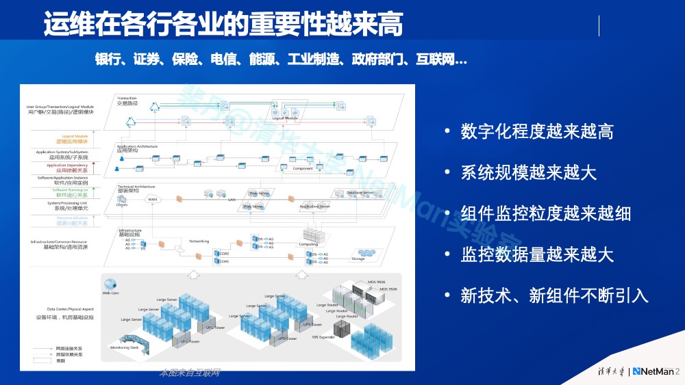 运维技术在各行各业的重要性越来越高,像银行、证券、保险、电信、能源、工业制造、政府部门、互联网等。由于各行各业数字化程度越来越高、系统规模越来越大、组件监控粒度越来越细、监控数据量越来越大以及新技术和新组件的不断引入,这些导致运维越来越难做,运维工程师也被海量高速的运维监控数据所淹没。